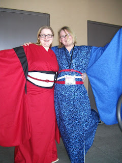 The three of us in our costumes. Having a fabulous time at Nebraskon 2011. D made all three costumes, inspired by Transformers for A. I'm supposed to be homaging Bumblebee, A is Optimus Prime, and D would be Red Alert. Really, we looked like a bunch of primary colored geisha, but fabulous geisha nonetheless.